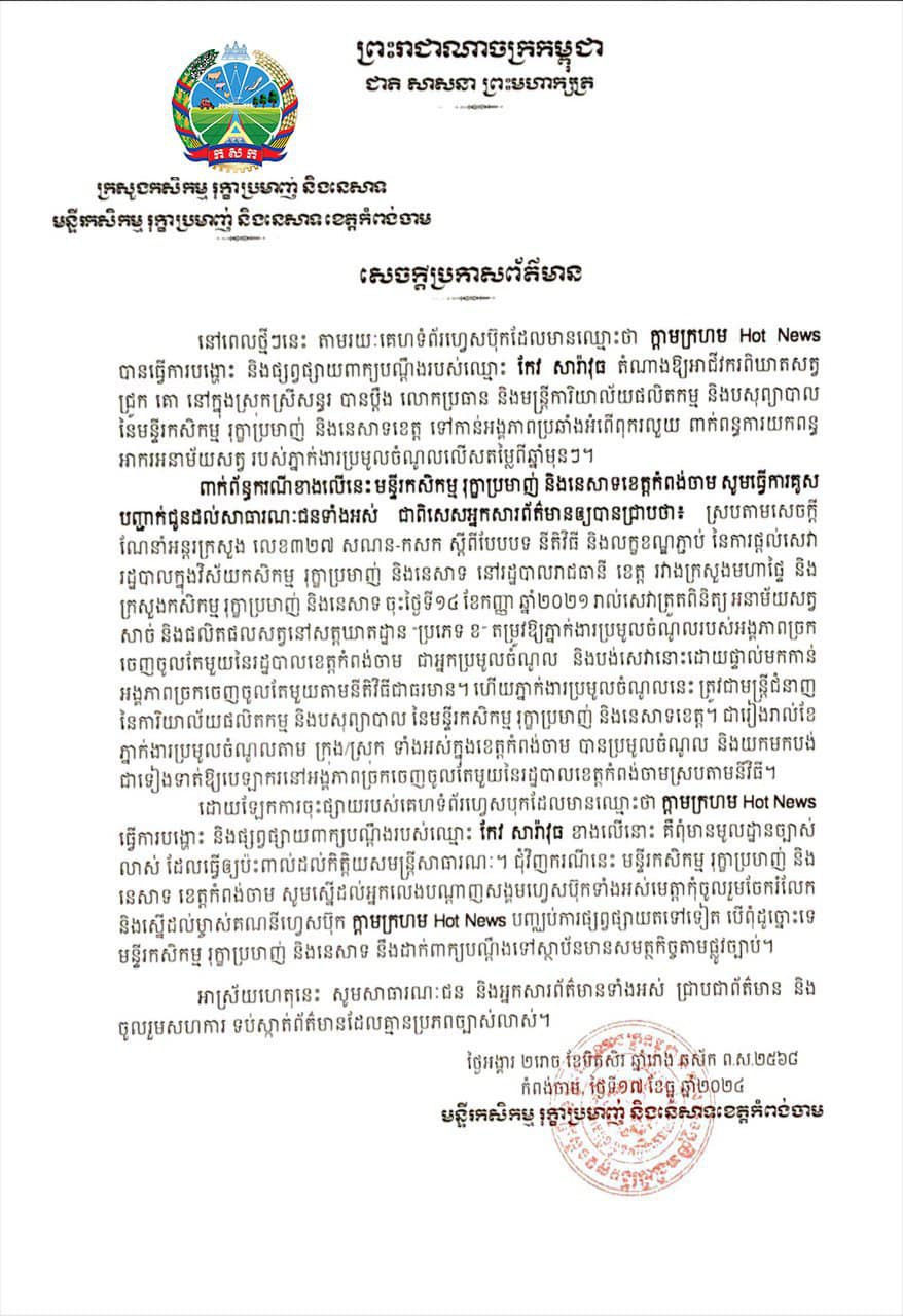 មន្ទីរកសិកម្ម ខេត្តកំពង់ចាម បំភ្លឺករណីផ្សព្វផ្សាយ អំពីពាក្យបណ្ដឹងរបស់តំណាងឱ្យអាជីវករពិឃា-តសត្វ បានប្ដឹង លោកប្រធាន និងមន្ត្រីការិយាល័យផលិតកម្ម និងបសុព្យាបាល ទៅកាន់អង្គភាពប្រឆាំងអំពើពុករលួយ មន្ទីរកសិកម្ម រុក្ខាប្រមាញ់ និងនេសាទខេត្តកំពង់ចាម ចេញសេចក្ដីប្រកាសព័ត៌មានស្ដីពីគណនីហ្វេសបុកដែលមានឈ្មោះថា ក្ដាមក្រហម Hot News ដែលបានផ្សព្វផ្សាយព័ត៌មានមិនមានមូលដ្ឋានច្បាស់លាស់ អំពីពាក្យបណ្ដឹងរបស់ឈ្មោះ កែវ សារ៉ាវុធ តំណាងឱ្យអាជីវករពិឃាតសត្វ ជ្រូក គោ នៅស្រុកស្រីសន្ធរ បានប្ដឹង លោកប្រធាន និងមន្ត្រីការិយាល័យផលិតកម្ម និងបសុព្យាបាល នៃមន្ទីរកសិកម្ម រុក្ខាប្រមាញ់ និងនេសាទខេត្ត ទៅកាន់អង្គភាពប្រឆាំងអំពើពុករលួយ ពាក់ព័ន្ធការយកពន្ធអាករអនាម័យសត្វ របស់ភ្នាក់ងារប្រមូលចំណូលលើសតម្លៃពីឆ្នាំមុនៗ៖