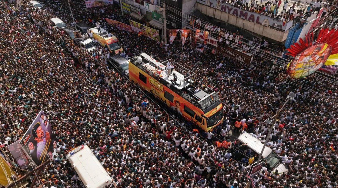 លោក Vijay ជាតារាភាពយន្តរដ្ឋ Tamil Nadu មួយរូប ក្នុងចំនោមតារាសម្តែងដែលរកប្រាក់ចំណូលបានច្រើនបំផុតក្នុងរយៈពេល ៣ទស្សវត្សរ៍ កំពុងទាក់ទាញហ្វូងមនុស្សយ៉ាងច្រើនកុះករឱ្យចូលរួមវេទិការសាធារណៈរបស់គាត់ ចាប់តាំងពីការចាប់ផ្តើមបង្កើតគណបក្សនយោបាយរបស់គាត់ គឺ Tamilaga Vettri Kazhagam ក្នុងឆ្នាំ ២០២៤។
