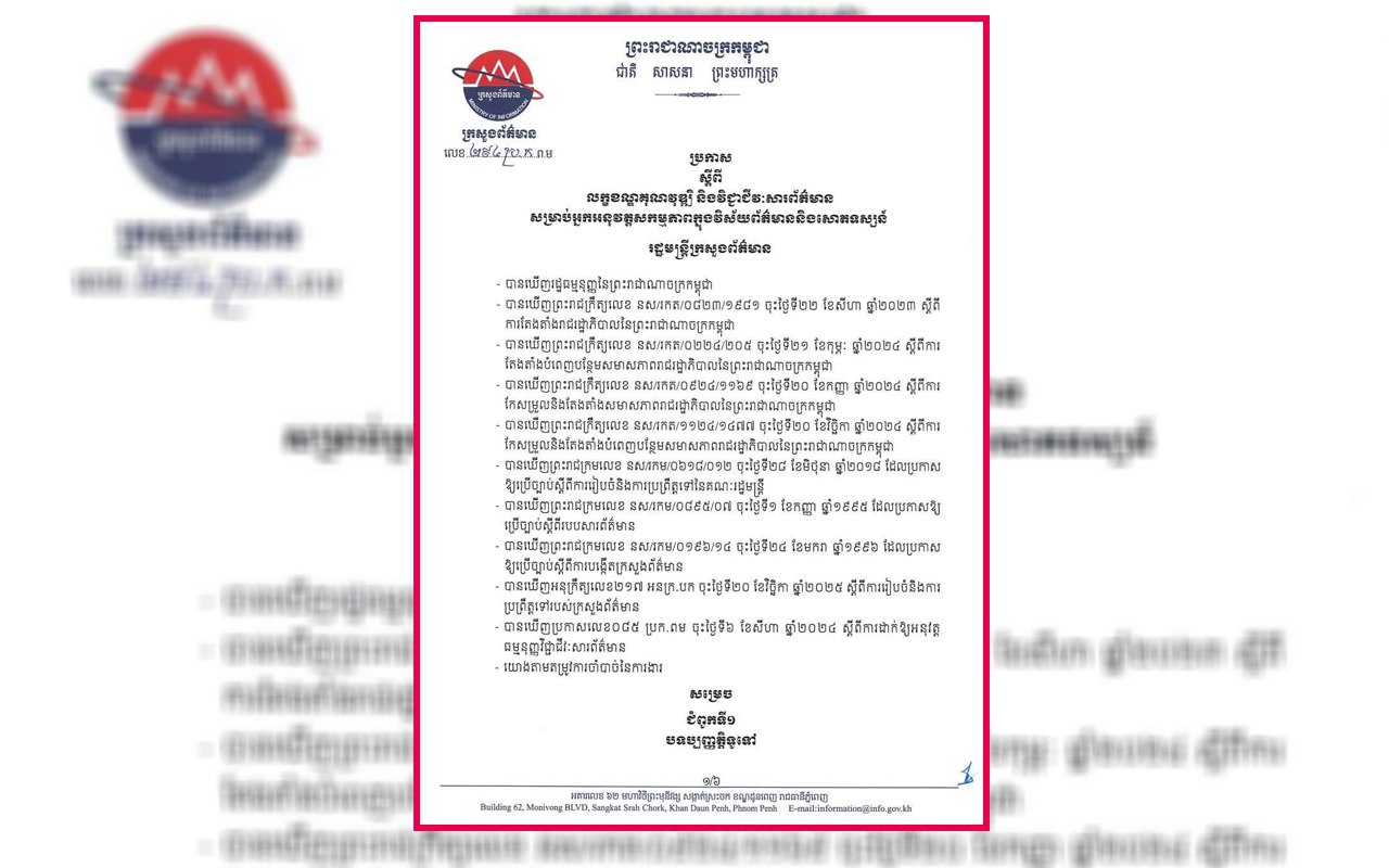 ក្នុងសេចក្តីប្រកាសព័ត៌មានចេញនៅថ្ងៃទី ២៧ ខែវិច្ឆិកា ឆ្នាំ២០២៥ ដែលមានចំនួន ៥ជំពូក ដោយបានភ្ជាប់ជាមួយលក្ខខណ្ឌមួយចំនួនដូចជា៖ ការរបង្កើតអង្គភាពកាសែត ទស្សនាវដ្ដី ព្រឹត្តិបត្រ បោះពុម្ពផ្សាយ និងគេហទំព័រត្រូវបានការកំណត់រចនាសម្ព័ន្ធដូចជា ៖ ចាងហ្វាងការផ្សាយ ឬបណ្ណាធិការ ឬម្ចាស់អង្គភាព,និពន្ធនាយក,ផ្នែករដ្ឋបាល,ផ្នែកហិរញ្ញវត្ថុ,ផ្នែកទីផ្សារ,ផ្នែកសារព័ត៌មាន។ ដោយឡែកចំពោះការបង្កើតស្ថានីយវិទ្យុអែហ្វអឹម ទូរទស្សន៍ និងគេហទំព័រ ត្រូវមានការកំណត់រចនាសម្ព័ន្ធ ដូចជា៖នាយកស្ថានីយ ឬម្ចាស់អង្គភាព,នាយកការផ្សាយ,ផ្នែកផលិត កម្មវិធី, ផ្នែកព័ត៌មាន ,ផ្នែកពិធីករ,ផ្នែកបច្ចេកទេស,ផ្នែករដ្ឋបាល,ផ្នែកហិរញ្ញវត្ថុ និងផ្នែកទីផ្សារ។