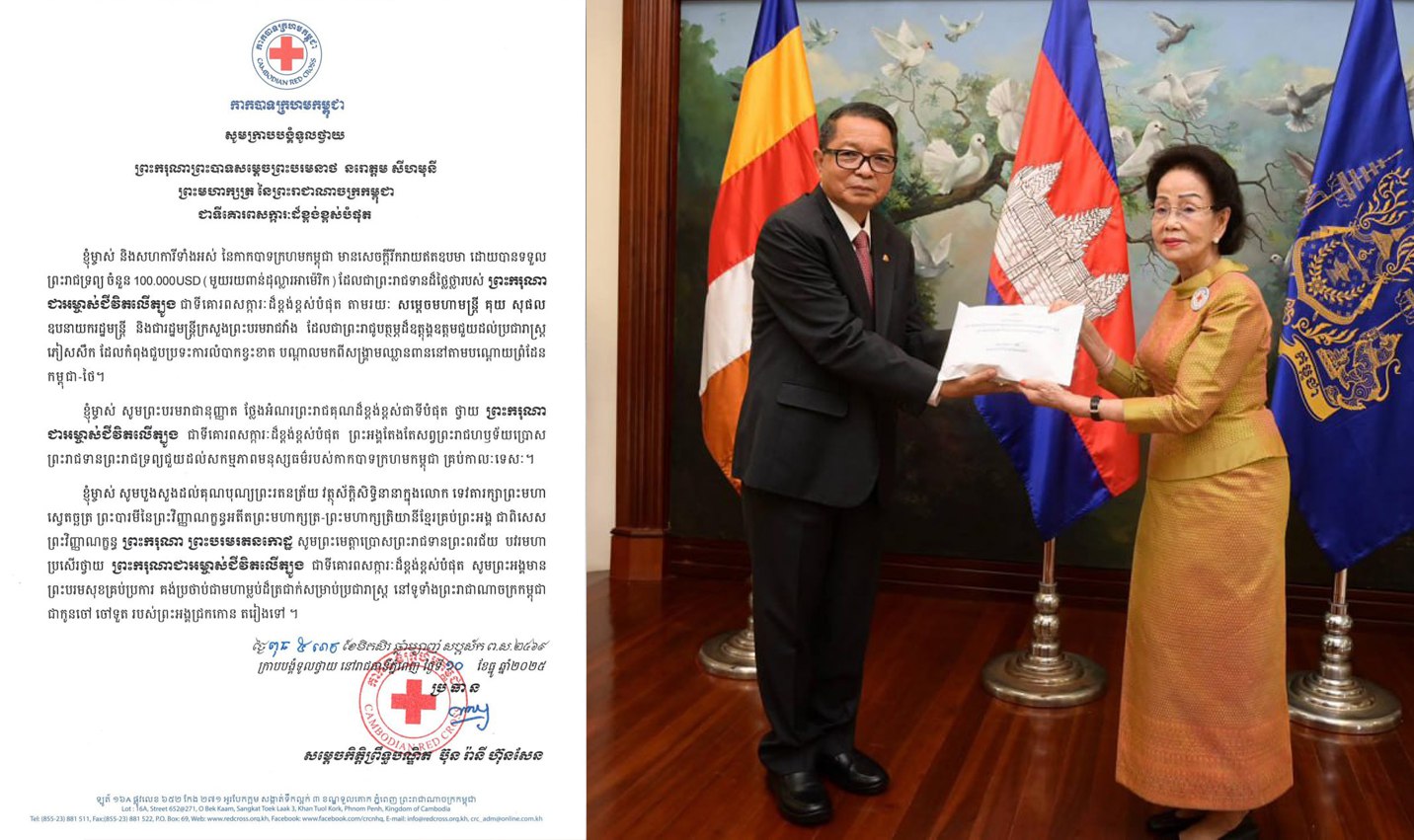 បន្ទាប់ពីទទួលបានព្រះរាជូបត្ថម្ភដ៏ឧត្តុង្គឧត្តមខាងលើនេះ សម្តេចកិត្តិព្រឹទ្ធបណ្ឌិត ប៊ុន រ៉ានី ហ៊ុនសែន ប្រធានកាកបាទក្រហមកម្ពុជា បានក្រាបបង្គំទូលថ្វាយនូវសារលិខិតថ្លែងអំណរព្រះរាជគុណ ព្រះករុណា ជាអម្ចាស់ជីវិតលើត្បូង ជាទីគោរពសក្ការៈដ៏ខ្ពង់ខ្ពស់បំផុត។ សារលិខិតនោះមានខ្លឹមសារដើមថា៖ «ខ្ញុំម្ចាស់ ព្រមទាំងសហការីទាំងអស់ នៃកាកបាទក្រហមកម្ពុជា មានសេចក្តីរីករាយឥតឧបមា ដោយបានទទួល ព្រះរាជទ្រព្យ ចំនួន 100.000USD (មួយរយពាន់ដុល្លារអាម៉េរិក) ដែលជាព្រះរាជទានដ៏ថ្លៃថ្លារបស់ ព្រះករុណាជាអម្ចាស់ជីវិតលើត្បូង ជាទីគោរពសក្ការៈដ៏ខ្ពង់ខ្ពស់បំផុត តាមរយៈ សម្តេចមហាមន្ត្រី គុយ សុផល ឧបនាយករដ្ឋមន្ត្រី និងជារដ្ឋមន្ត្រីក្រសួងព្រះបរមរាជវាំង ដែលជាព្រះរាជូបត្ថម្ភដ៏ឧត្តុង្គឧត្តមជួយដល់ប្រជារាស្ត្រ ភៀសសឹក ដែលកំពុងជួបប្រទះការលំបាកខ្វះខាត បណ្តាលមកពីសង្គ្រាមឈ្លានពាននៅតាមបណ្តោយព្រំដែន កម្ពុជា-ថៃ»។