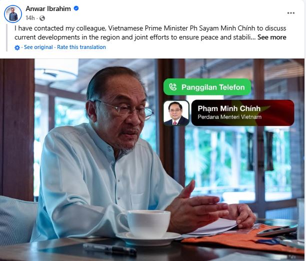 តាមរយៈបណ្តាញសង្គមហ្វេសបុកផ្លូវការ នៅថ្ងៃទី១៣ ខែធ្នូ នេះ, លោក អាន់វ៉ា អ៊ីប្រាហ៊ីម នាយករដ្ឋមន្ត្រីម៉ាឡេស៊ី បានរៀបរាប់ថា «ខ្ញុំបានទាក់ទង ទៅសហសេវិក របស់ខ្ញុំ គឺ នាយករដ្ឋមន្រ្តីវៀតណាម លោក Pham Minh Chính ដើម្បីពិភាក្សាអំពីការវិភិវឌ្ឍន៍ នាពេលបច្ចុប្បន្ន នៅក្នុងតំបន់ និងកិច្ចខិតខំប្រឹងប្រែងរួមគ្នាដើម្បីធានាការថែរក្សាបាន នូវសន្តិភាព និង ស្ថិរភាព។ ក្នុងនាមខ្ញុំ ជាប្រធានអាស៊ាន ខ្ញុំសូមជម្រាបថា ម៉ាឡេស៊ីនឹងរៀបចំកិច្ចប្រជុំពិសេស នៃរដ្ឋមន្ត្រីការបរទេសអាស៊ាន នាពេលខាងមុខ ដើម្បីវាយតម្លៃស្ថានភាព គាំទ្រវិធានការកាត់បន្ថយភាពតានតឹង និងពង្រឹងតួនាទីរួមរបស់អាស៊ាន ក្នុងការរក្សាសន្តិភាព ក្នុងតំបន់»។