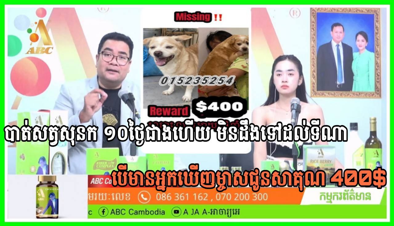 បាត់សត្វសុនក ១០ថ្ងៃជាងហើយ មិនដឹងទៅដល់ទីណា បើមានអ្នកឃើញម្ចាសជូនសាគុណ 400$។ MC: ណារ៉ុង ABC & កញ្ញា K-2