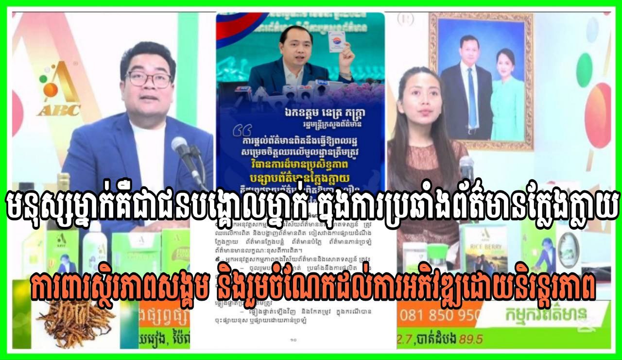 មនុស្សម្នាក់គឺជាជនបង្គោលម្នាក់ ក្នុងការប្រឆាំងព័ត៌មានក្លែងក្លាយ ការពារស្ថិរភាពសង្គម និងរួមចំណែកដល់ការអភិវឌ្ឍដោយនិរន្តរភាព។ MC: ណារ៉ុង ABC & កញ្ញា ពៅ កោះក្របី
