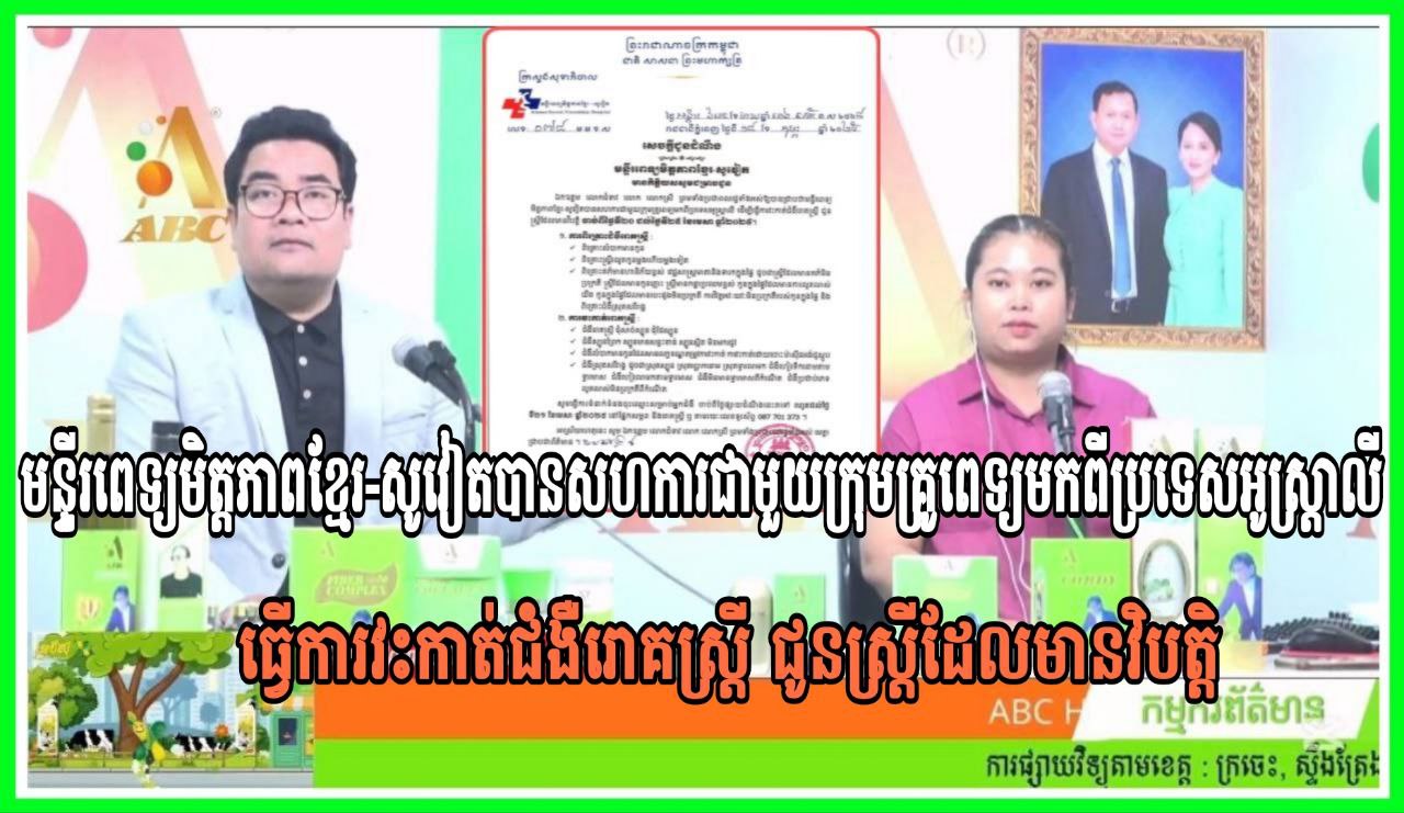 មន្ទីរពេទ្យមិត្តភាពខ្មែរ-សូវៀតបានសហការជាមួយក្រុមគ្រូពេទ្យមកពីប្រទេសអូស្ត្រាលី ធ្វើការវះកាត់ជំងឺរោគស្រ្តី ជូនស្រ្តីដែលមានវិបត្តិ ។ MC: ណារ៉ុង ABC & កញ្ញា តីតី